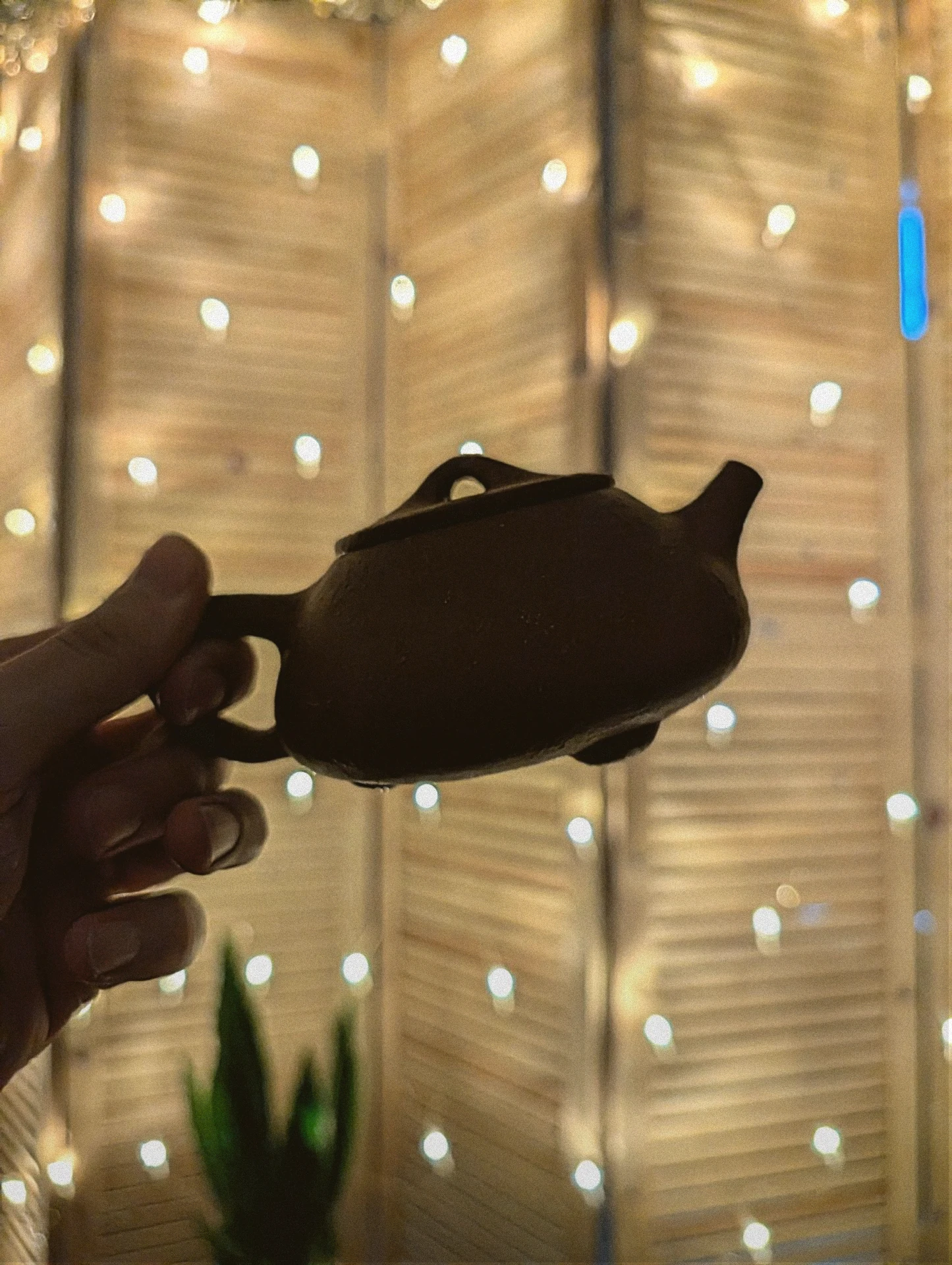 Чайник в темноте на светлом фоне гирлянд